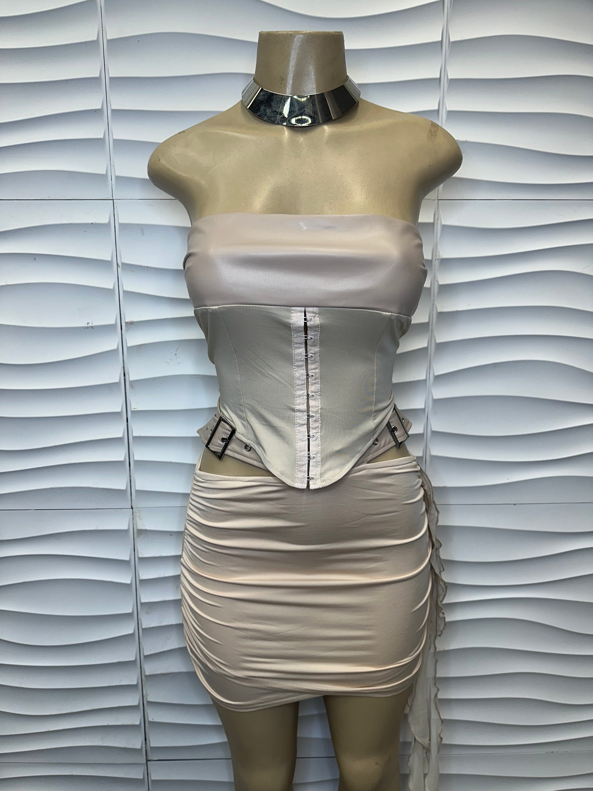 Satin, structure, and slay. The Soft Trap Set combines a smooth nude bandeau top, structured corset-style waist cincher, and ruched mini skirt. Feminine in shade, powerful in shape.